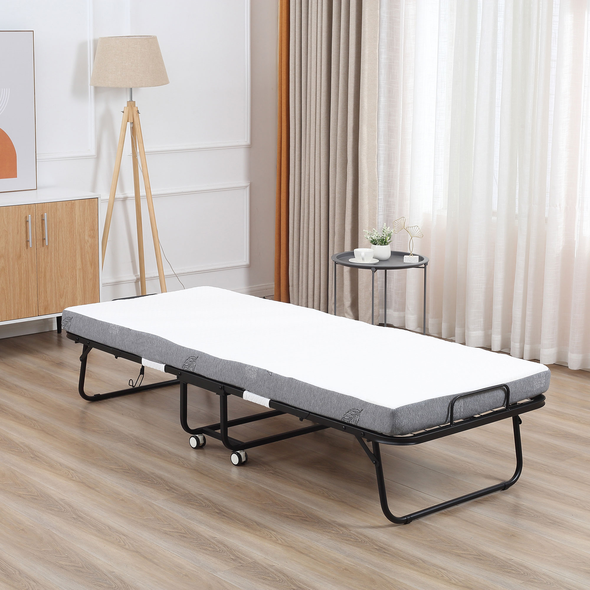 Gæsteseng, sammenklappelig seng, rejseseng med hjul, madras, stål, hvid+sort