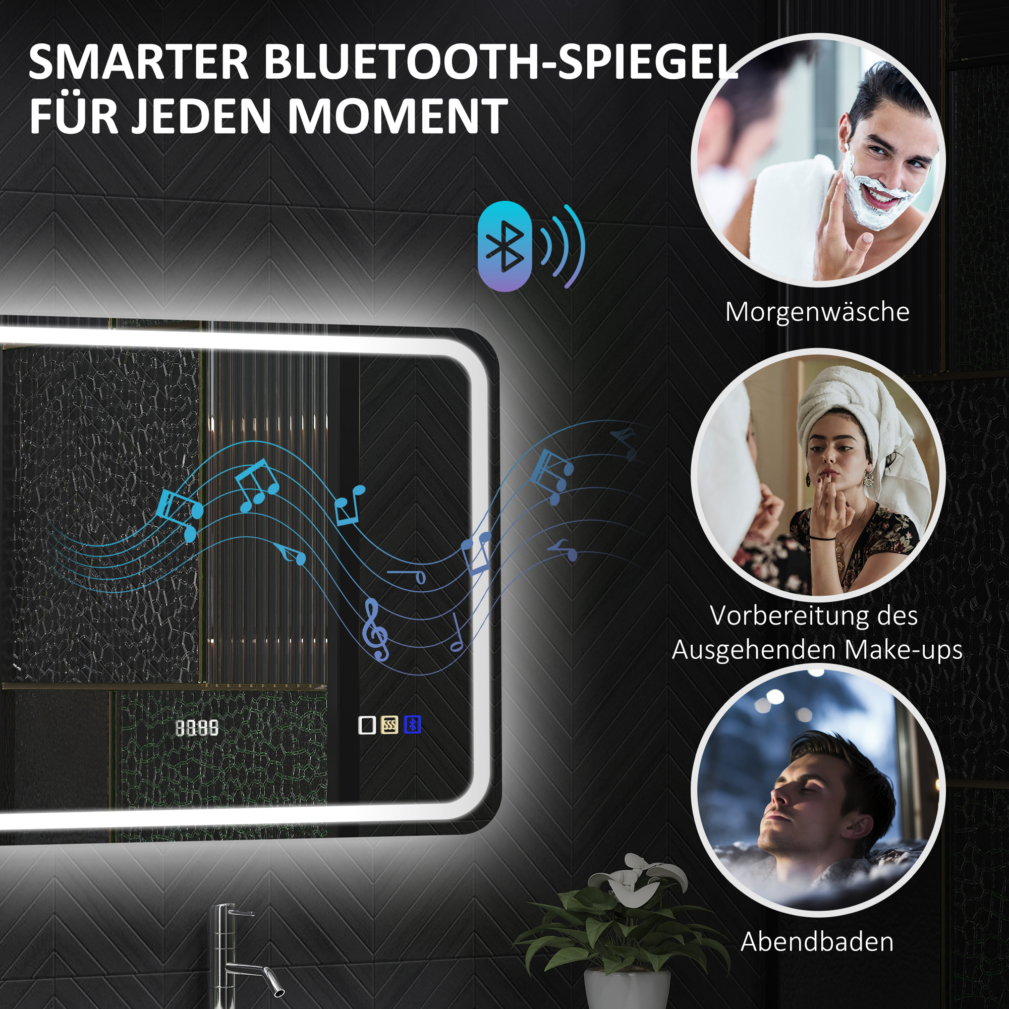 - Med tidsvisning og musikfunktion: Nyd din yndlingsmusik på LED-badeværelsesspejlet takket være Bluetooth-funktionen, mens du gør dig klar til dagen. Det indbyggede ur holder dig også opdateret uden stress