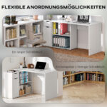 Det alsidige HOMCOM-skrivebord til hjemmekontoret kan nemt omdannes fra en L-form til et langt skrivebord og tilpasses dine behov. Det har åbne rum, et skab og en stor skuffe til organisering. Med sit moderne, minimalistiske design forbedrer skrivebordet din arbejdsplads som både en elegant arbejdsstation og en funktionel opbevaringsenhed.