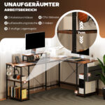 L-formet skrivebord 168 x 120 cm hjørneskrivebord med opbevaringsrum, opbevaringstaske, vendbart computerbord med skærmstativ, gamingbord til kontor, hjemmekontor, rustik brun
