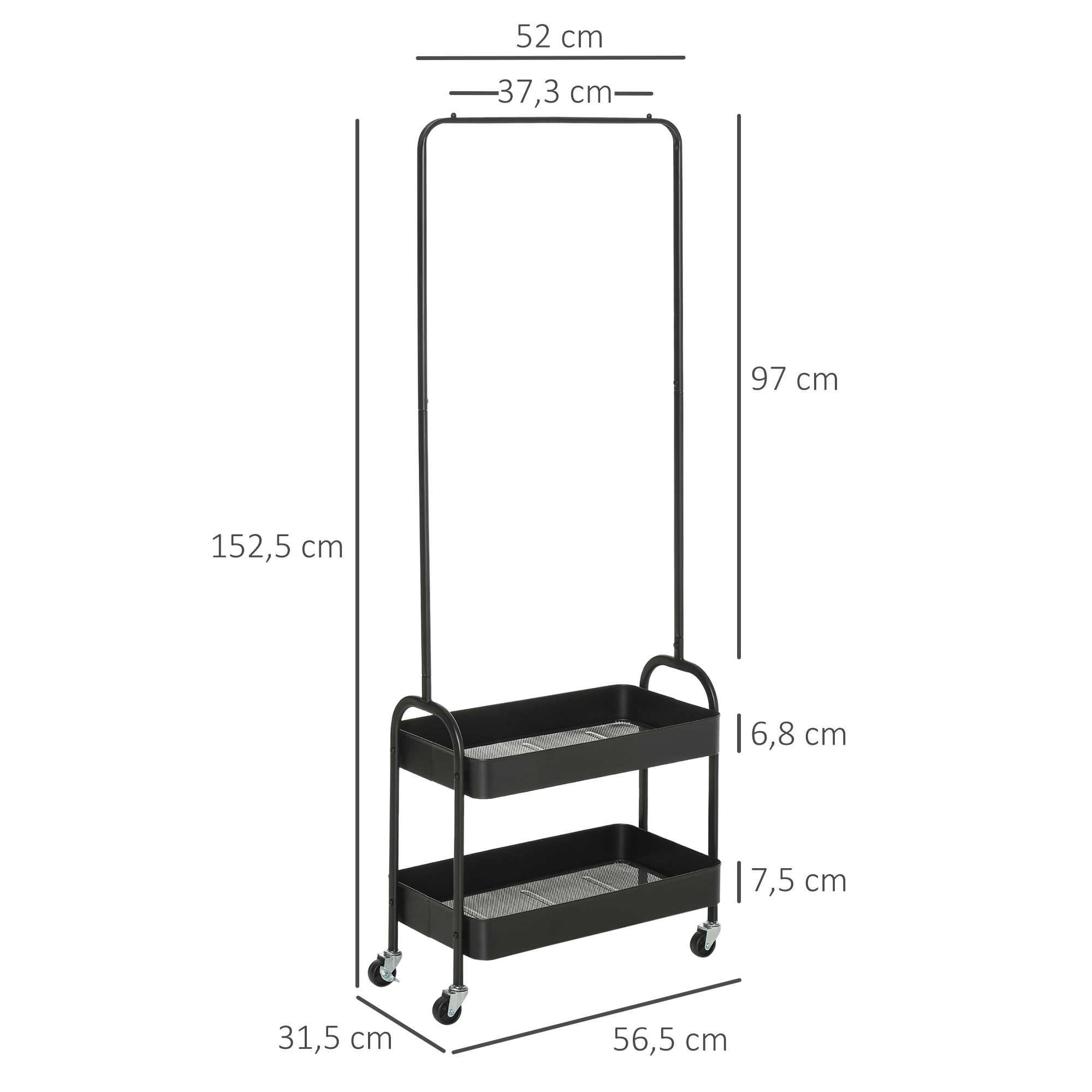 Dette mobile tøjstativ med opbevaring fra HOMCOM optimerer pladsudnyttelsen. Dens kompakte størrelse er ideel til trange rum såsom gange eller garderober. Den robuste ramme af pulverlakeret stål på hallens knagerække understøtter pålideligt frakker, jakker og andre beklædningsgenstande. To nederste hylder på den stående knagerække giver opbevaringsplads til sko og tasker. Takket være fire letløbende hjul kan den også flyttes ubesværet.